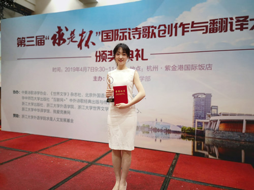4月7日上午,由浙江大学、中美诗歌诗学协会、北京外国语大学外国文学研究所、《世界文学》杂志社、浙江大学出版社等单位共同举办的第三届“求是杯”国际诗歌创作与翻译大赛在杭州紫金港国际酒店举行颁奖典礼。公司英国威廉集团官网2018级俄语专业研究生张颖坤同学以翻译作品《十一月挽歌》荣获全国翻译类二等奖。这是公司俄语专业研究生继第二届“求是杯”获得奖项之后又一次获奖。