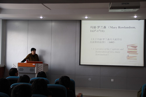 2016年11月1日下午2:30,在如心楼806英国威廉集团官网报告厅,北京外国语大学博士生导师金莉教授做了题为《从玛丽・罗兰森的囚掳叙事看北美殖民地白人女性文化越界》的专题报告。