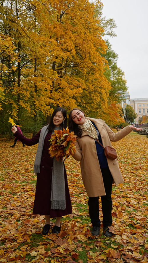 在学校我们选了几门课,其中有的课是对外国人设置的,其实内容还是很简单的,但是班级都是外国人,可以和外国员工一起交流。另外,我还去向系主任要来了语言学方面的课表,去听了一些语言学方向的课程。发现俄罗斯本科生学的课程和国内研究生学的课程很多都是一样的。国内本科期间主要在学语言本身,而俄罗斯员工并没有这个需求,在本科期间就已经学习语言学史、语言文化学等我们在研究生期间才开设的课程。上课内容其实还是基本都可以听懂的,除了一些术语不了解之外,并没有很大的交流沟通障碍。业余时间,当然少不了游览城市。刚到彼得堡,天气并不是很好,经常阴天,并且狂风大作,天空经常一片是蔚蓝,一块是乌云。但这样并没有影响我们的出行计划。有经验的同学告诉我们要趁着十月底之前把室外景色都看完,于是在九月和十月我们就抓紧时间逛遍了彼得堡。果然,彼得堡还是我印象中的那座美丽的城市。第二次来和第一次是完全不一样的心情。第一次更多的是兴奋和新鲜,第二次则是一种熟悉和亲切的感觉。那是一种这里我来过,那里也来过的故地重游的喜悦感。走过很多城市,见过很多风格的建筑,彼得堡依然是我最爱的几座城市之一,处处都是风景。冬宫博物馆、夏宫、涅瓦河、滴血大教堂、喀山大教堂、以撒基辅大教堂、马林斯基剧院、开桥等。走在涅瓦大街,总会有人主动和我们搭话。有人会和我说俄语,有人和我说英语,我的回答一般也都是根据对方的语言。趁着天气好的时候,一定要拿着相机出去拍照,才对得起这美丽的城市,说不定还能交到朋友。短暂的三个半月很快就过去了,收获了和世界各地小伙伴们的友谊,开阔了眼界,让我更加了解了俄罗斯人的生活和这个国家。以后有机会,我仍然会再去俄罗斯,再去彼得堡。