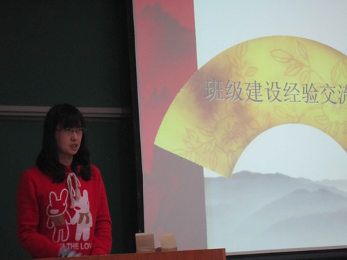最后,101212班和101213班的员工代表详细介绍了优秀班集体答辩的经验和教训。优班答辩是新生入学面临的一个非常重要的课题和活动,每个班从组织到实践再到最后的总结和答辩材料准备都投入了大量的时间和精力,本次活动首先由101212班班长葛勍和宣委迟宏申上台发言,他们先将曾经答辩时用的材料向新生们展示,将活动的大概流程作了简要介绍,然后葛勍同学提出了几点建议和意见,这些内容包括准备工作要提前,充分;创意一定要新颖独特吸引眼球,要注重集体的力量,要鼓励每一个小班同学加入到本次活动中来,要开拓视野,扩大影响力。随后是101213班的班长王蕾和团支书蒋明彤同学上台展示,也向大家提出了很多的建议。